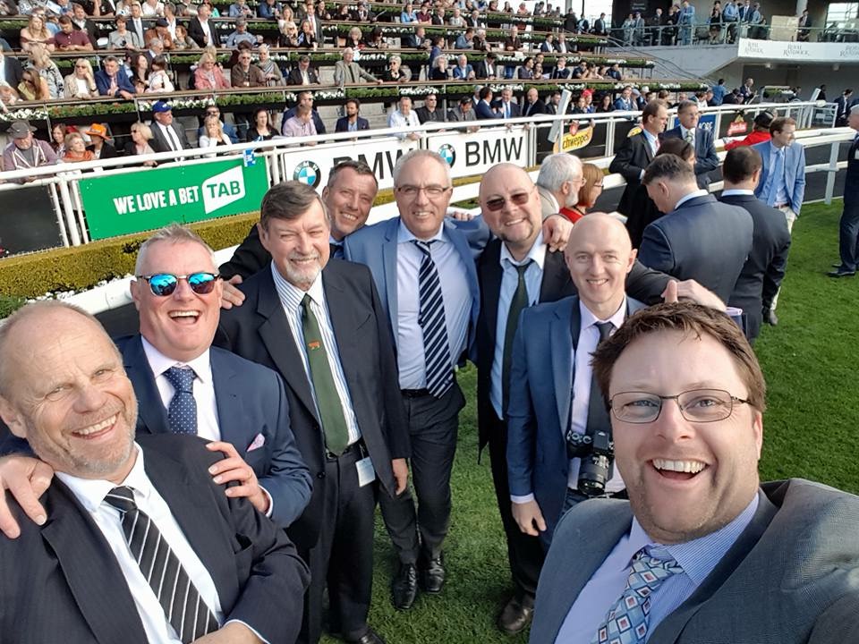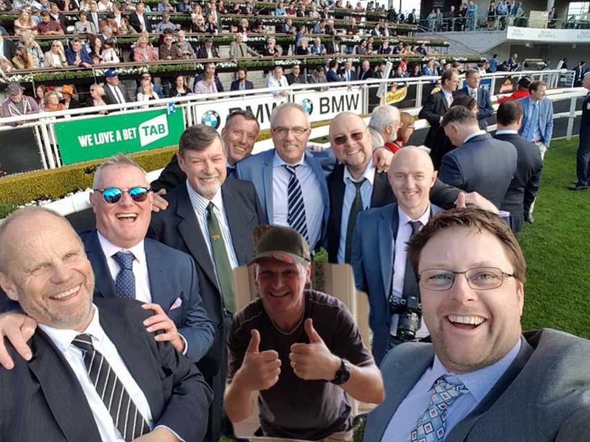 IN THE MOUNTING YARD WITH WINX. From left to right – John (aka Sparrow), Paul (Guv), Brian (Trebles/dad), Ian (Batman), Greggy (Bundy), Me (Cool Hand), Lee (Neo) and Jase (Bolschy).